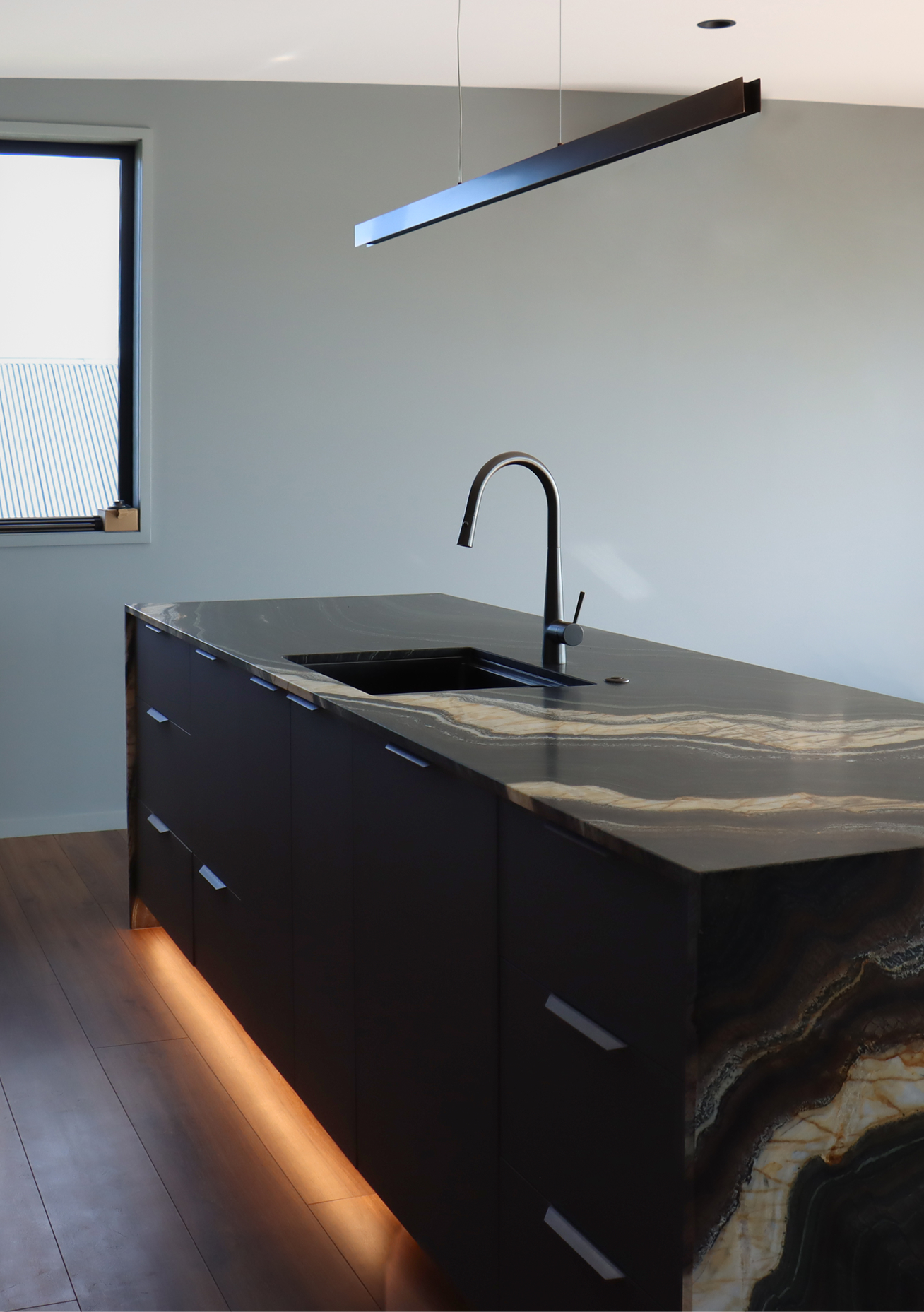 The undisputed hero of this kitchen is the stone. We pushed our fabrication capabilities to the limit to let the material speak, creating a massive island with twin waterfall ends that anchor the room. The drama continues on the rear wall with a book-matched splashback, where the gold and amber veins flow seamlessly across the surface like living art. Against the dark grey, matte cabinetry, the stone creates a striking contrast that is both bold and warm.