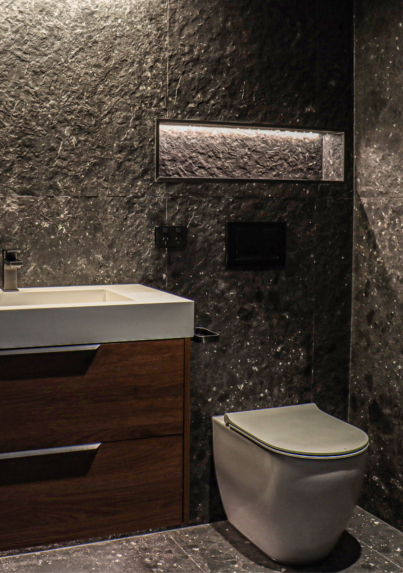Executing a project of this complexity with a client based predominantly overseas required a seamless level of trust and communication. We managed the entire process remotely, ensuring that the transition from concept to installation was flawless. We extended this design language beyond the kitchen, crafting custom bathroom vanities that carry the dark, textural theme throughout the home, proving that consistency is key to luxury.